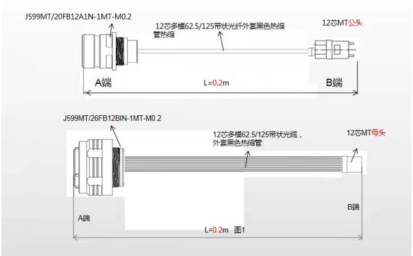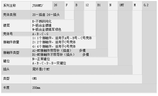 例 1: J599MT/26FB12B1N-1MT-M0.2,表示 J599MT 插头,B 号壳体,镀层为铝合金镀镍,接触件为 1 个 12 芯 MT 插针,N 键位,1MT为尾纤是1个MT,M为OM1,长度为200mm。
