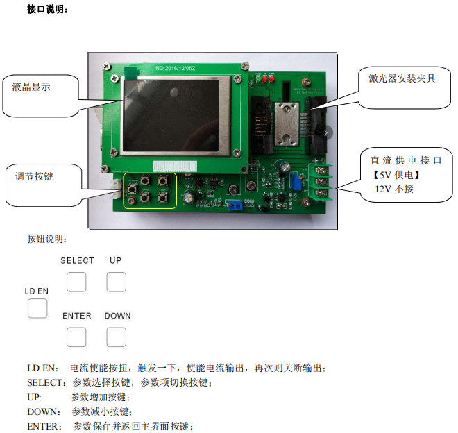 3、参数设定此部分可对激光驱动电源的参数进行设定,读取设定的参数,对应参数项中输入想 设定的数值,击设置键即可设定。点击读取键则激光驱动电源的参数反馈并显示在对应参数项中。注意:入电压为直流 5V,4.8~5.2V)超过此电压可能造成模块永久损坏!