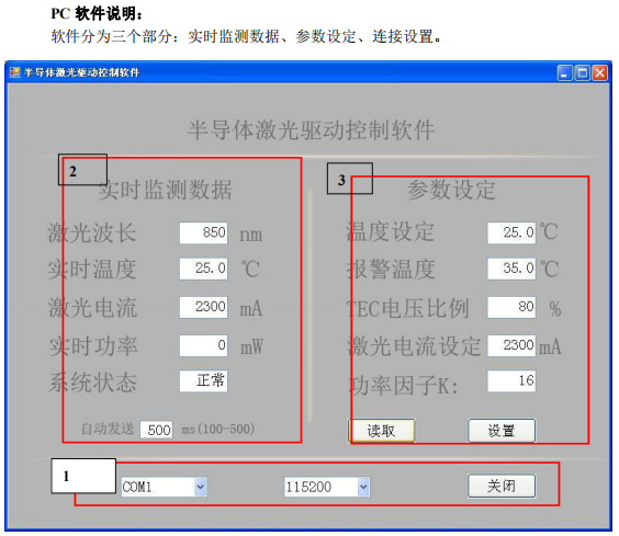 1、连接设置:光驱动电源通过串口线连接 PC 后,置此处,左起依次是:口、波特率、连接按键。选择对应的串口,产品波特率为 57600。设置好后点击打开按键则可连接激光驱动电源对其监测和设置。