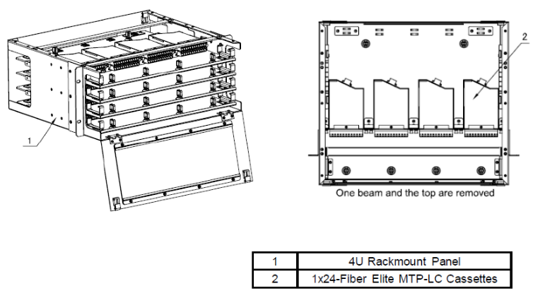 部件描述: 机架式配线架,4U 抽屉式,384 光纤室,配 16 个 24 芯 MTP-LC 原线暗盒(使用 1x24 原线 MTP),装有 LC 单模式适配器(带蓝色外壳)