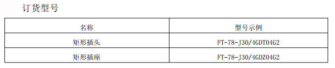 FT-78-J30/4GDT04G2:该产品为两光两电矩形插头,壳体为不锈钢钝化材质;其中孔位 1、4 装 16#电接触件,孔位 2、3 装 20#光接触件;FT-78-J30/4GDZ04G2:该产品为两光两电矩形插座,壳体为不锈钢钝化材质;其中孔位 1、4 装 16#电接触件,孔位 2、3 装 20#光接触件。