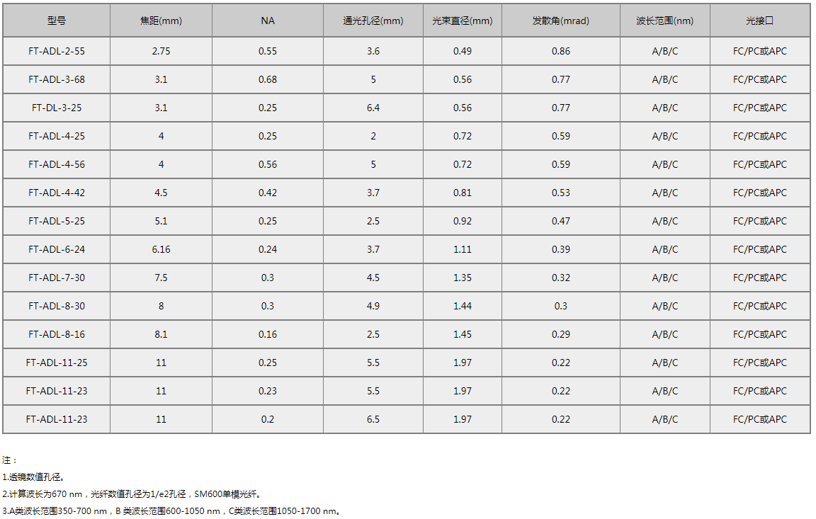 透镜调节准直器(焦距2.7-20 mm)