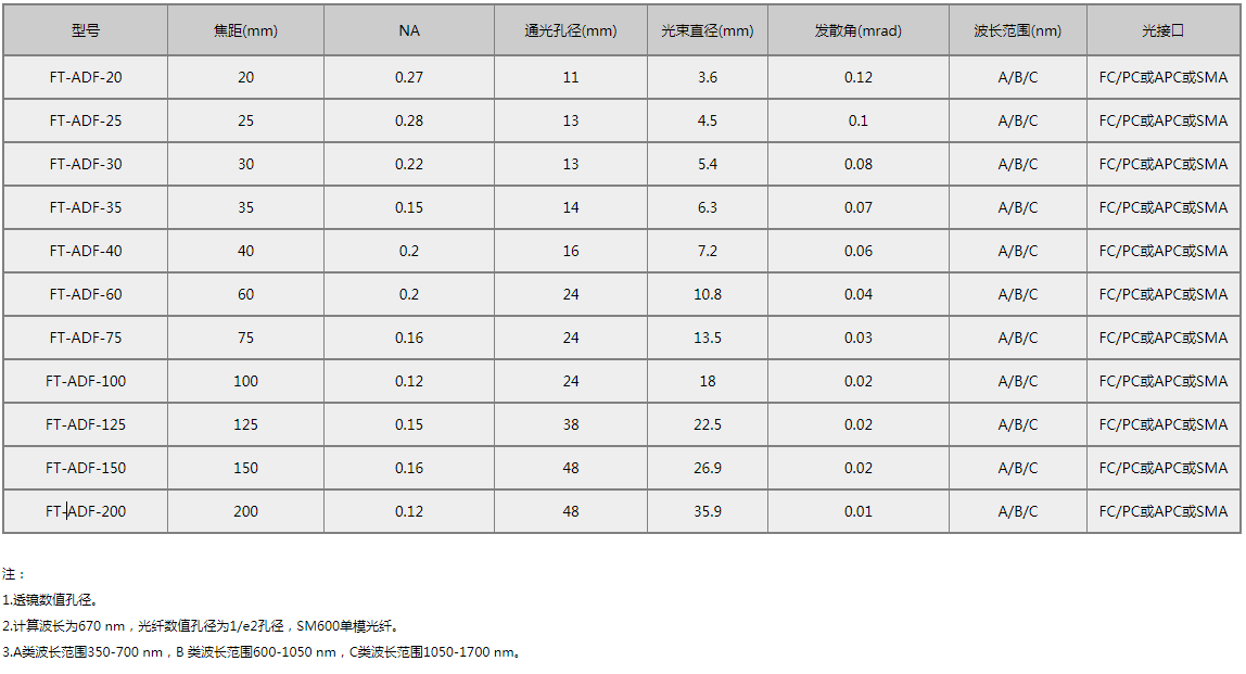 区别于透镜调节准直器,光纤调节准直器是通过调节光纤发光端面距离透镜的相对位置进行物距调节,采用调焦环结构设计,光纤的空间方位(即准直光束的偏振主轴PSP)无旋转。通过调焦环可对输出光束准直、发散或汇聚状态进行大范围调整。焦距范围20至200 mm,光束直径3.6至36 mm(高斯强度分布1/e2),光纤输入一侧可集成光学元件,可根据要求加工无磁性钛合金外壳。光接口可为FC/PC、FC/APC、SMA。透镜两侧都有AR膜,分为-A、-B与-C型,覆盖可见光至近红外波段。
