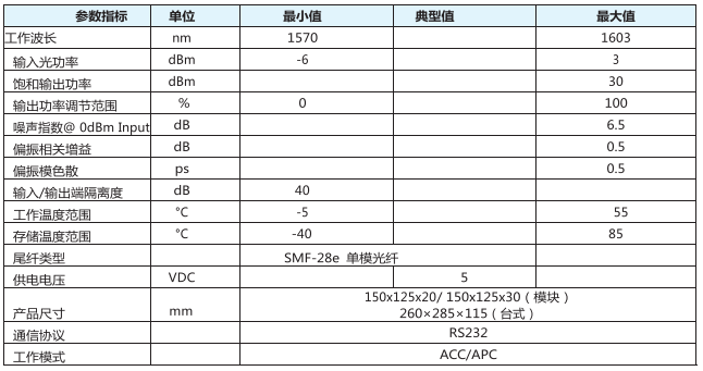 波段功率掺铒光纤放大器是一款高饱和输出功率的功率光纤放大器(Booster-EDFA);用于对发射端信号进行放大,提高发射端光功率,提升信号的传输距离。该系列放大器内部采用优化的光路结构,配合电信级的 980nm/1480nm 泵浦激光器,实现高饱和功率放大输出。基于稳定的高效的内部控制系统,结合高精度的 ATC 和 ACC(APC)控制电路实现放 大器稳定、可靠运行。产品全部状态参量与配置信息可由上位机进行远程监控与配置。该系列光纤放大器有多种封装形式,满足不同应用要求。