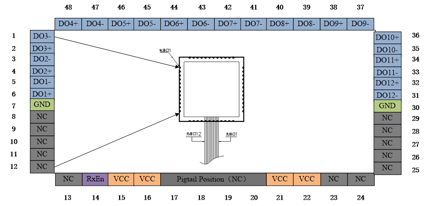 F-tone LCC48 12路并行接收光模块,6.25G每通道,B类管脚图