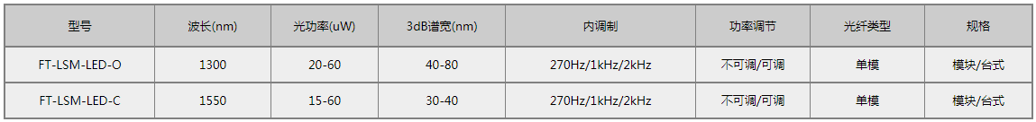 发光二极管LED光源是一种低成本、宽光谱范围(典型值80nm)与低相干度宽带光源。采用数字自动精密温度控制 (PWM) 和功率控制 (APC) 技术保证了光功率和谱形的长期稳定。单模光纤输出,可选择多种类型连接器或适配器,方便与外部设备的快速低损耗、快速互连。输出光功率可调节,并可选 270Hz/1kHz/2kHz 内调制模式(更高速率可根据客户要求定制)。可按客户要求定制单通道、多通道输出。