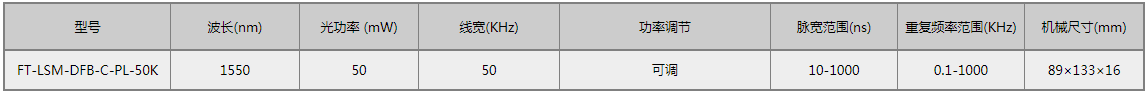 脉冲窄线宽激光器模块设计用于激光雷达、激光测距、MOPA光纤激光器、长距离光时域反射仪、Raman光纤分布式传感与气体检测技术。半外腔型激光器具有典型值50kHz的超窄线宽,自带脉冲信号发生器与阻抗匹配驱动单元,通过直接调制半导体激光器使其工作在极窄的脉冲宽度(最小值10ns),且可根据客户要求调节脉冲宽度与脉冲重复频率。本系列产品可与OPEAK脉冲光纤放大器系列产品配合使用,可大幅度提高脉冲峰值功率达KW级,特别适合于激发光纤内部的非线性效应。内置脉冲同步电路,在给出光脉冲信号时,同步电信号通过SMA接口输出,便于用户将模块植入系统。模块内置驱动电路与逻辑控制电路,对激光器温度、模块温度等关键信息实时监测。模块可通过上位机配置工作参数。模块出厂预设状态参数依据具体订货型号或客户要求提供默认配置。