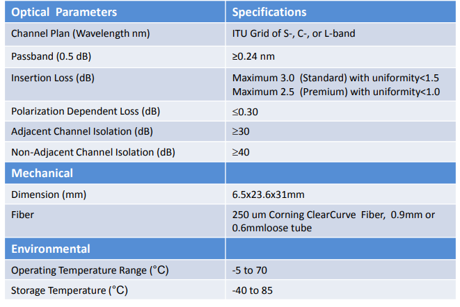 ● Based thin film filter technology, free space, Temperature independent performance; Extremely compact and ultra-low insertion loss