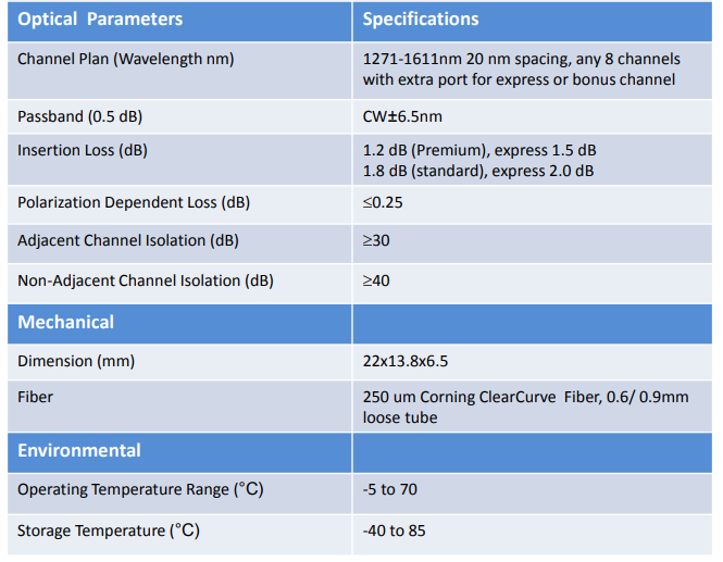 ● Mux or Demux, Combine/separate 8 Channels with 20nm spacing Metro Access, Cable TV, WAN, Datacom