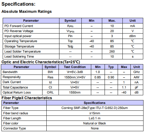 ● Low Capacitance and High Speed with a Mini PIN Structure