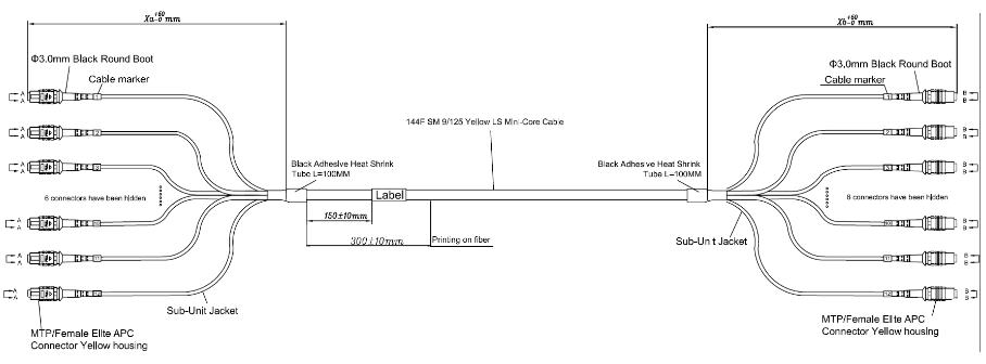 部件描述:干线组件,144-光纤,MTP 不带导针(母头) 单模Minicore (OFNR),A 端分叉长度 600 毫米,B 端分叉长度 600 毫米,总长度 5 米,无Pulling Eye