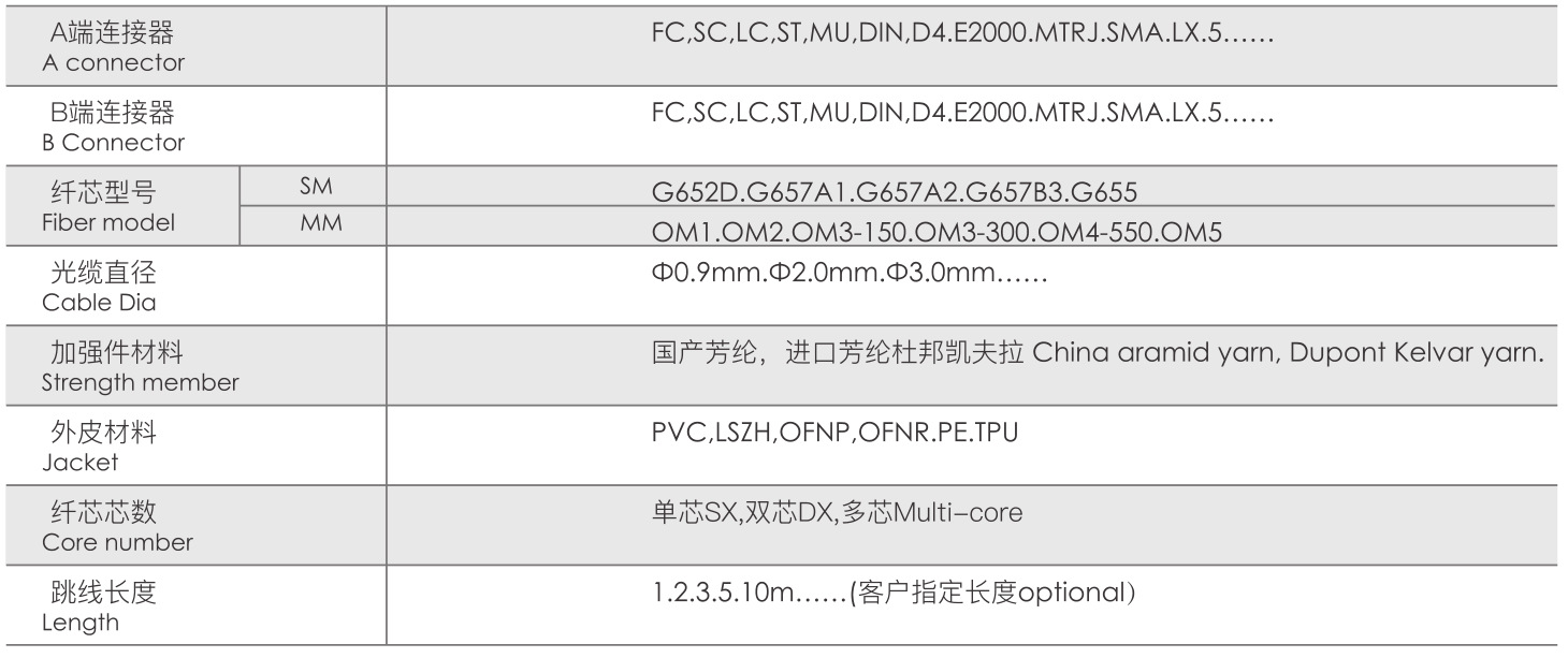 该系列的跳线有多种分类方式,可根据两端光纤连接器型号分类SC,FC,LC,ST,MU,DIN,D4,E2000,LX.5,MTRJ,VF-45光纤跳线,SC-FC……等转接型光纤跳线.