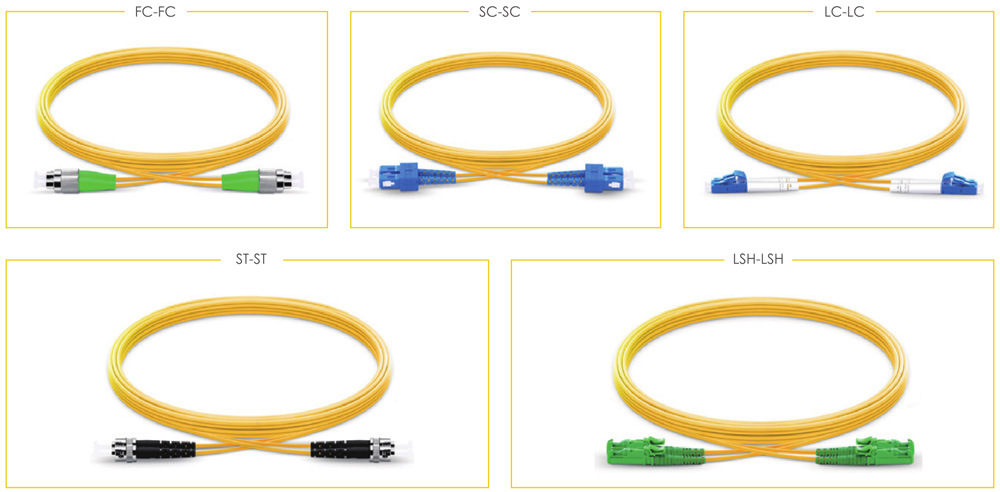 Patch cords are classified by connectors at both ends,there are SC,FC,LC,ST,MU,DIN,D4,E2000,LX.5,MTRJ,VF-45, and SC-FC……etc hybrid patch cords.