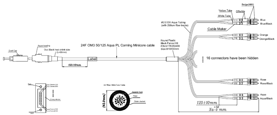部件描述: MXC 插头至 LC/PC 扇出,24 光纤,OM3,Mini-core 光缆