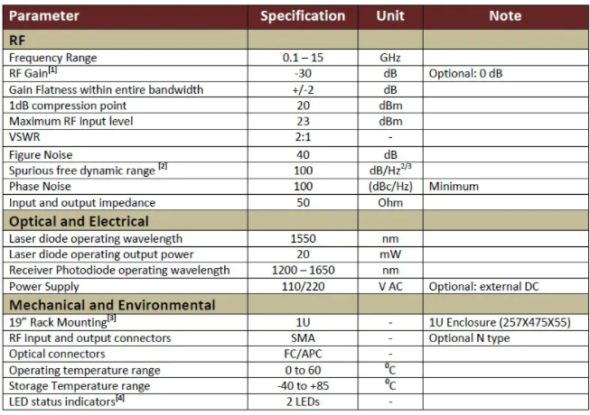 根据带宽的不同,有8GHz, 15GHz, 20GHz不同射频带宽的产品,另有3GHz, 2.4GHz, 1.5GHz等低频段产品。本款为15GHz带宽。RF光纤收发器(RF over Fiber)产品参数如下: