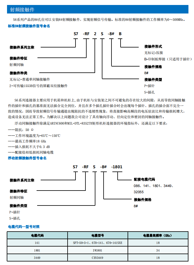 ● 标准8#射频接触件使用频率0~500MHz,浮动8@射频接触件使用频率0~18GHz