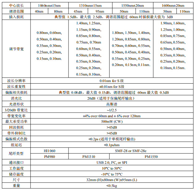 LT-WLTF-NE 系列电动可调谐窄带滤波器基于自由空间光学傅里叶变换与衍射光栅梳理设计而成,优异的光学设计提供了前所未有的低插损及低偏振相关损耗,精密的微电机结构设计是滤波器实现高分辨率和高重复性的波长调谐。LT-WLTF-NM 系列电动可调谐窄带滤波器工作波长覆盖 X,O,S,C,L 波段,带宽 0.1-1.9nm 可选,单模或保偏尾纤可选,且保偏尾纤输出信号消光比大于 20dB。手动调谐旋钮不锈钢材料设计,调节精度高,重复性好。