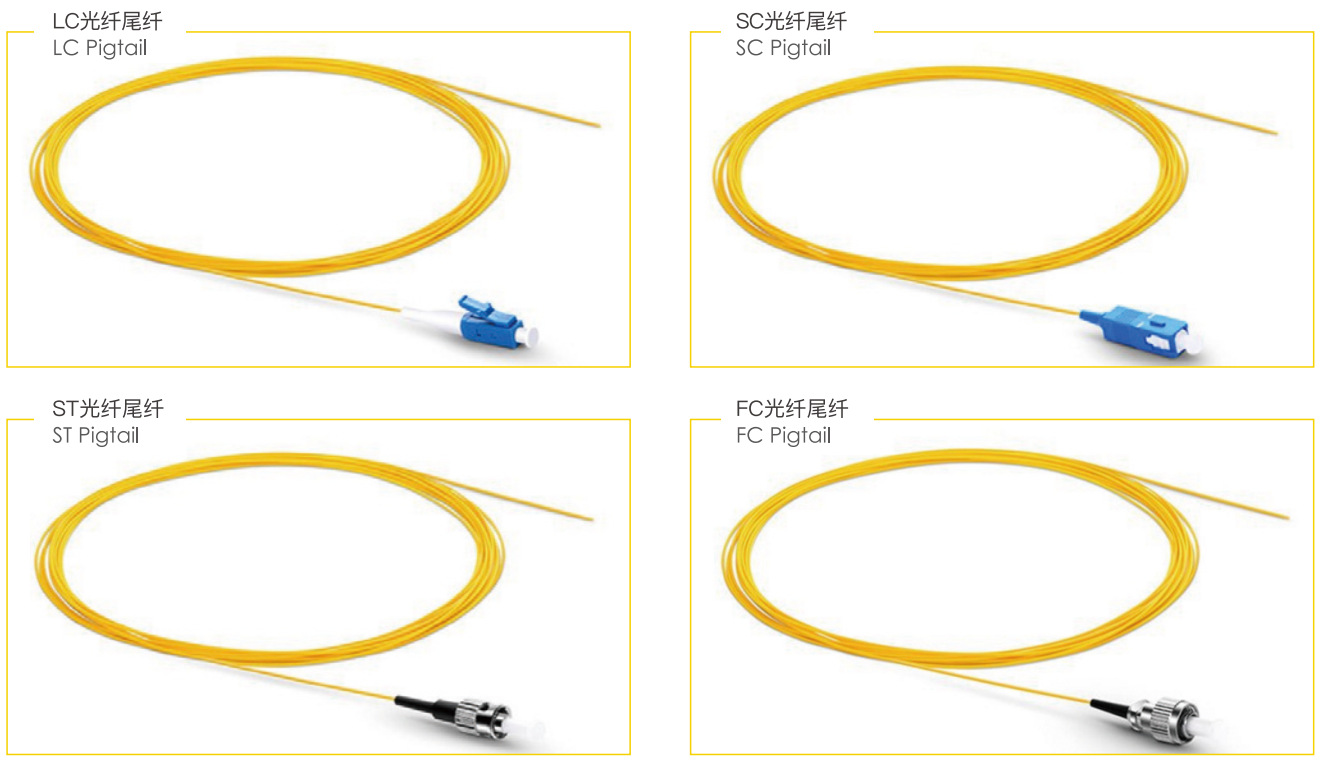 常规室内布线尾纤可按照连接器的型号分类,分为FC,SC,LC,ST,DIN,D4,MU……等