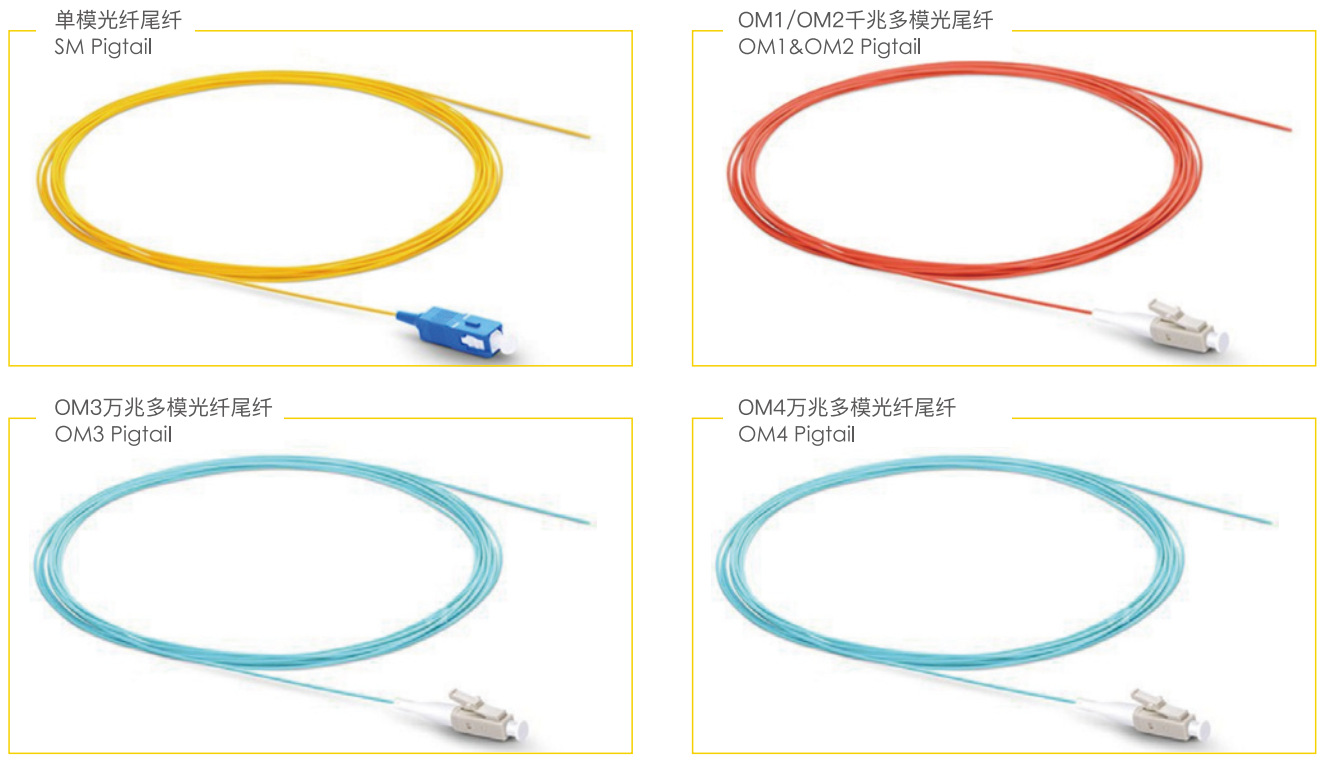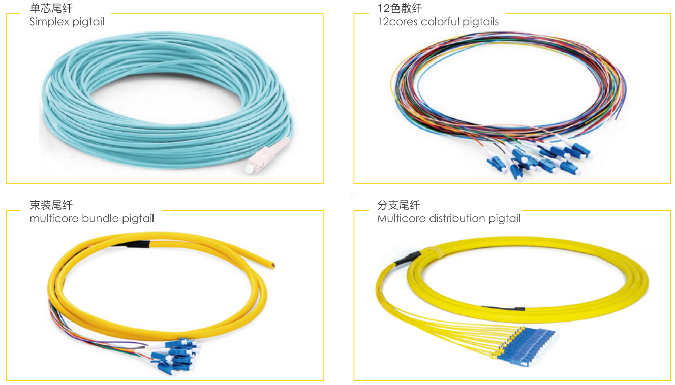 It’s classified by fiber model, there are SM, OM1,OM2,OM3,OM4 Pigtails .9按照光缆的结构分类,可分为单芯尾纤,多芯散纤,多芯束装尾纤,多芯分支尾纤