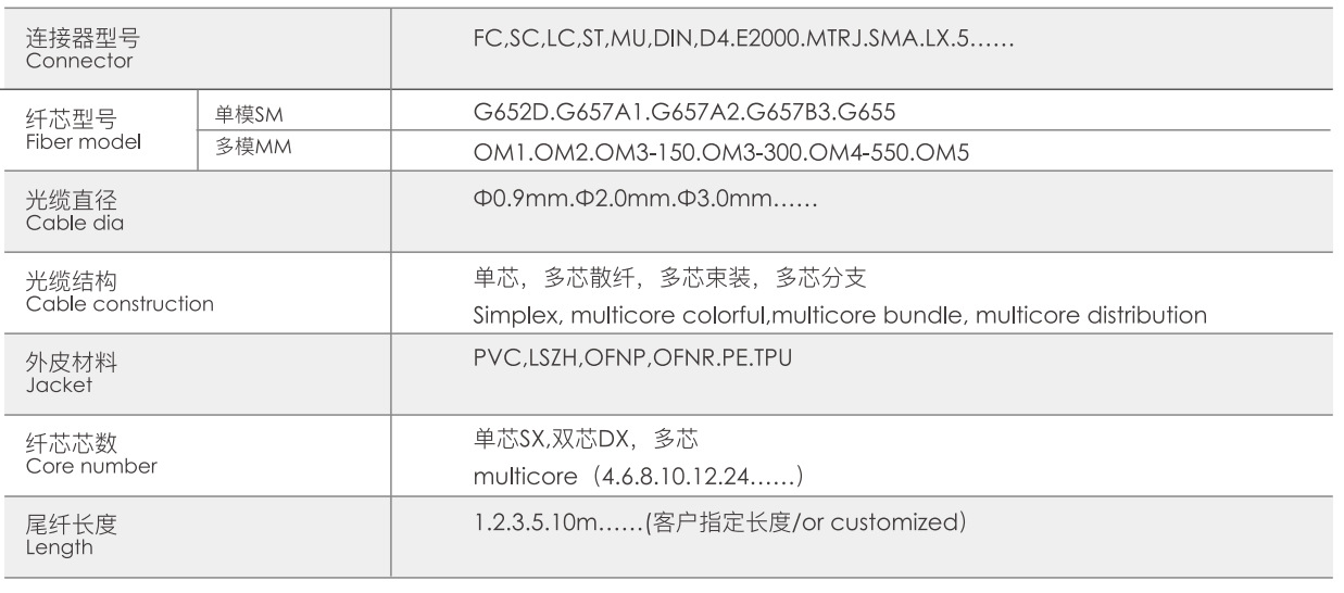 It’s classified by cable structure, there are simplex pigtail, multi-core pigtails,multicore bundle pigtail, multicore distribution pigtail .9订货信息表Order information:9