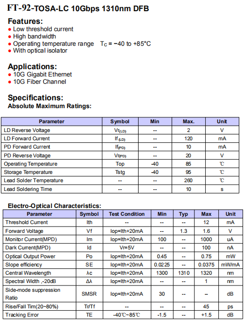 北亿纤通专业研发生产:TOSA-LC 10Gbps 1310nm DFB, 是一家专业的TOSA-LC 10Gbps 1310nm DFB厂家,具有优质的TOSA-LC 10Gbps 1310nm DFB品质,有很好的TOSA-LC 10Gbps 1310nm DFB价格,TOSA-LC 10Gbps 1310nm DFB海量交付给国防、军工、航空、航天、兵器、舰船、雷达、电子、核工业、军事、电力、铁路、医疗、交通、通信、电信、政府、国防科技工业系统内大专院校及科研院所
