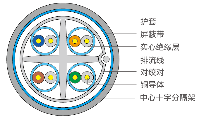 6A 类屏蔽电缆具有高品质电气及机械性能,超越ISO/IEC 11801 和ANSI/TIA-568-C.2 标准的要求。电缆结构为总铝箔屏蔽,可达到优异的屏蔽效果。紧凑式的线缆设计。数据电缆适用于构化布线,可用于传输数字或模拟语音、视频和数据信号。适用于所有遵从EN 50173-1 和ISO/IEC11801 标准的ICT 网络应用。适用于以太网供电。