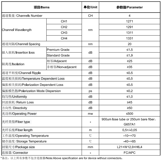 产品为FT-13系列波分复用器,仅展示部分参数,如有需要,请联系我们。