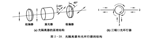 光隔离器的结构如图2-28(a)所示,它包括起偏器,旋光器和检偏器三个组成部分,其工作原理基于法拉第旋转的非互易性,正向入射起偏器后成为某一形式的线偏振光,旋光器使通过的光发生45°的右旋转。检偏器的透光轴和起偏器成45°角放置,恰好与起偏器的输出光方向一致,使其顺利通过,从而使入射光获得了低损耗传输。而与入射光的反射光,仅有与检偏器光轴一致的部分光通过的检偏器,再经过旋光器旋转45°正好与起偏器透光轴垂直故不能通过,所以光隔离器能够阻止反射光通过。