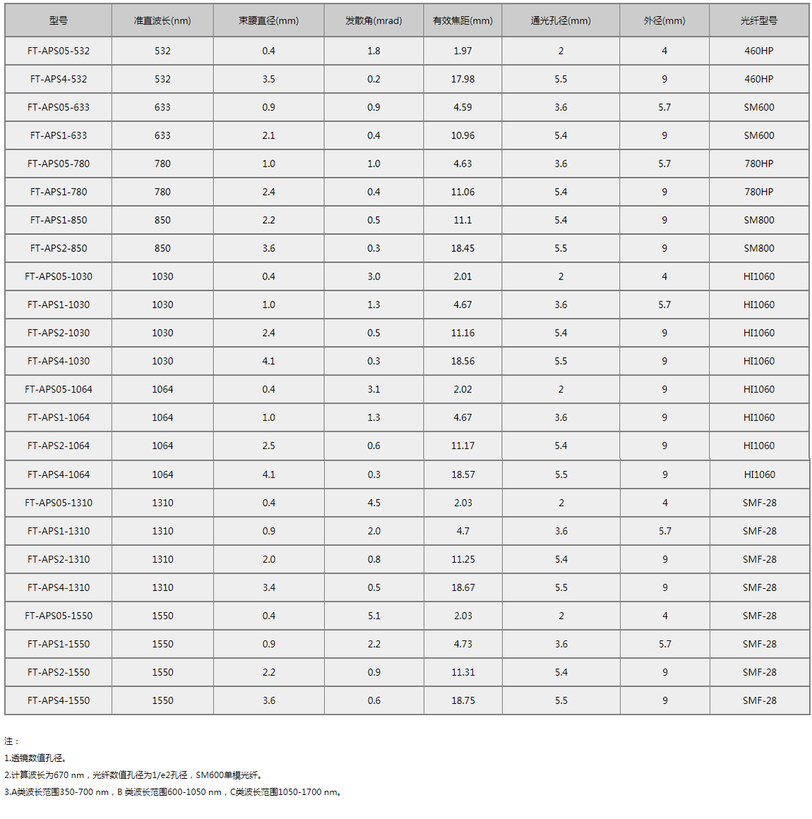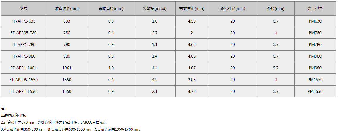 APS系列单模光纤尾纤型准直器由一个不锈钢(或钛合金)外壳和一个非球面透镜组成。每个准直器带一米长的单模尾纤,在设计波长处具有衍射极限性能。与非球面透镜准直一侧的光纤端面成8°倾角抛光,非球面透镜双侧镀有增透膜,可以最大程度地减小设计波长处的反射率(回波损耗>60 dB)。采用内部角度补偿结构,避免为了匹配光纤端面倾角而使用弯折外壳(针对外径为9 mm的准直器)。对于焦距小于5 mm的型号,光纤端面倾角引起的偏差可以忽略,因而这些版本的外壳也是直的。