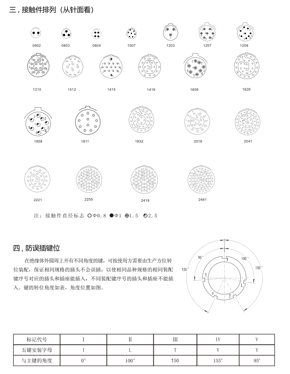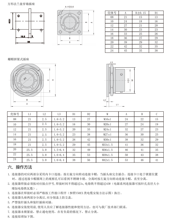 本产品是具有快速连接和快速分离、体积小、重量轻等诸多优点的内卡口式镀紧的圆形电连接器。接触件为焊接式,壳体有屏蔽和非屏蔽两种,具有密封、防尘和防雨的性能。安装方式有法兰盘式、螺帽拼紧式、穿墙式等。