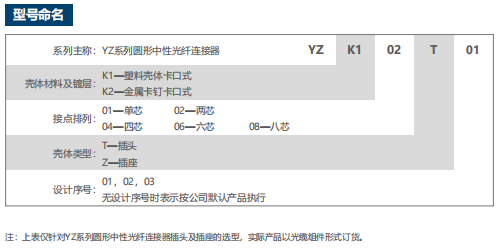 YZ系列圆形中性光纤连接器是一种符合GJB1919标准的多芯、中性、卡口锁紧式圆形光纤连接器,包括活动连接器和车壁连接器两种。外壳采用优质铝合金材料或高分子复合材料制成,具有抗振、耐压、防水,防盐雾、防尘等优良性能。