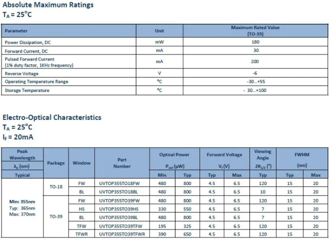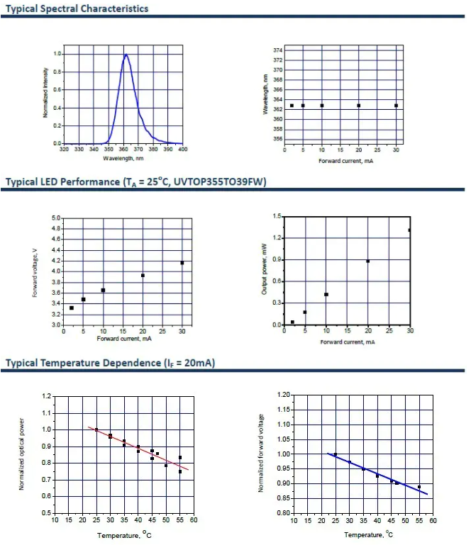 此系列的产品为紫外LED和深紫外LED发光管(UV,DEEPUV),波长包括240nm,245nm, 250nm,255nm,260nm, 265nm, 270nm, 275nm, 280nm, 285nm, 290nm, 300nm, 305nm, 310nm, 315nm, 320nm, 325nm,330nm, 335nm, 340nm,345nm, 350nm,355nm.封装窗口可以做成平面窗口,半球形窗口,球形窗口等。
