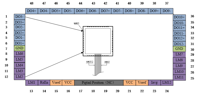 F-tone LCC48 12路并行接收光模块,3.5G每通道,B类管脚图
