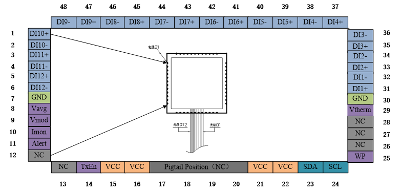 F-tone LCC48 12路并行发射光模块,3.5G每通道,B类管脚图